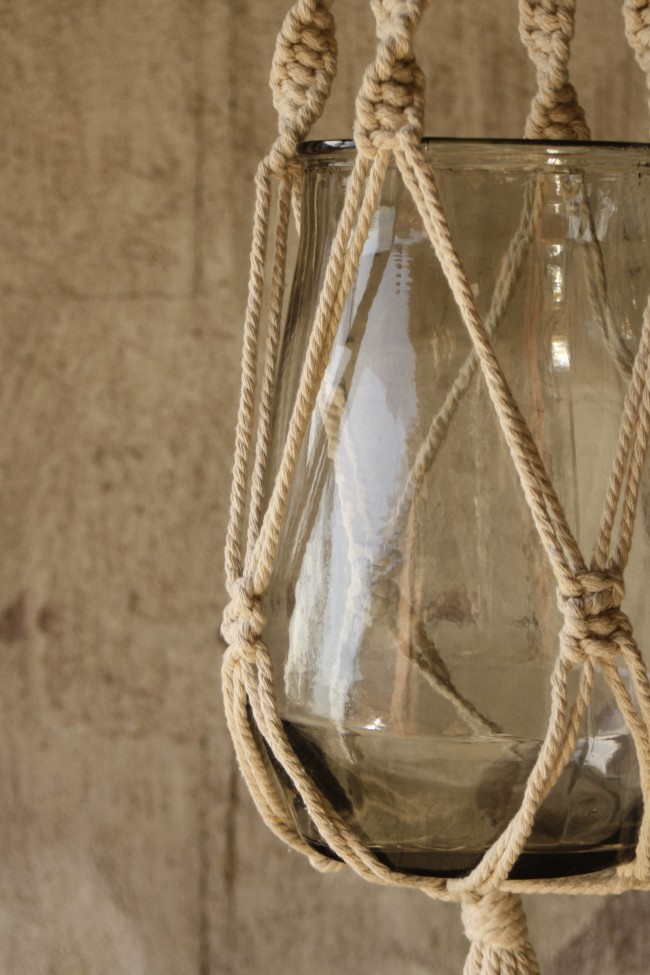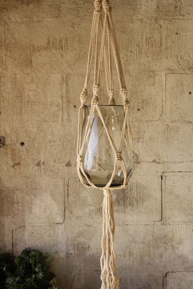 Stor vakker glassampel med tauoppheng. Kremfarget tau.