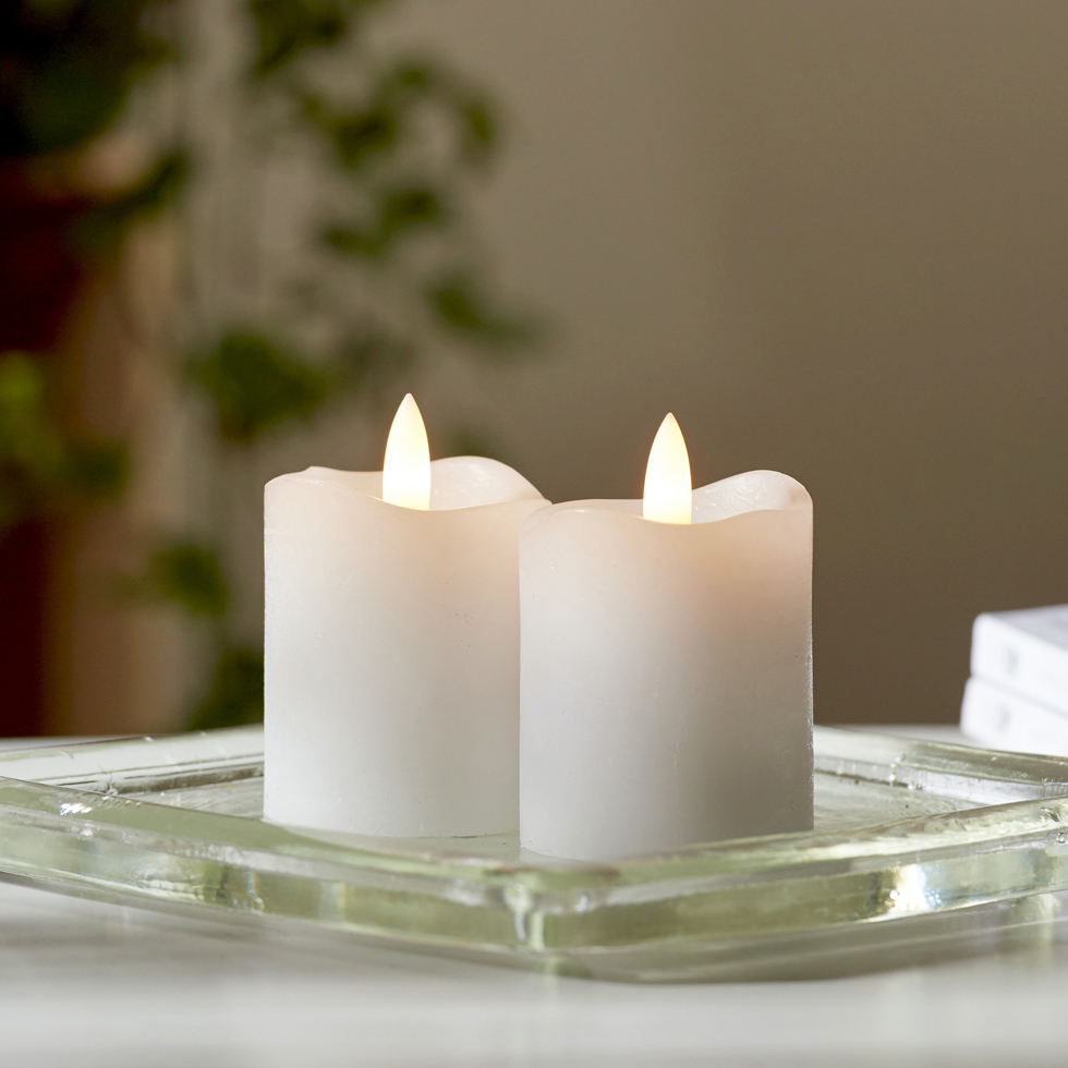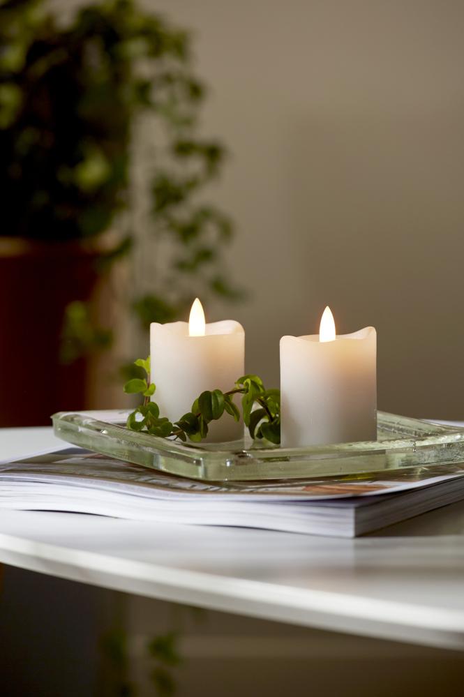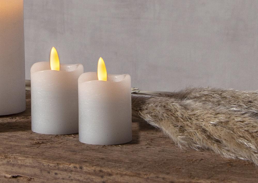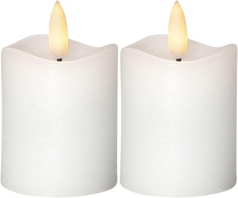 Realistiske LED-batterilys i form av 2 hvite blocklys i voks. De har en varm hvit lysglans og en veldig naturtro flamme og er for innendørs bruk. Du aktiverer enkelt timeren på den svarte knappen, og lyset lyser i 6 timer og er avslått i 18 timer, og deretter gjentar det seg til du slår av lyset. Fint, stemningsfullt og brannsikkert!