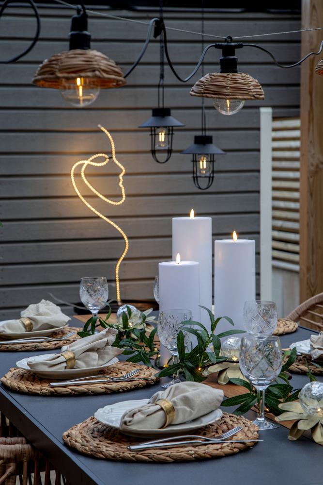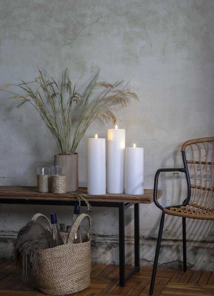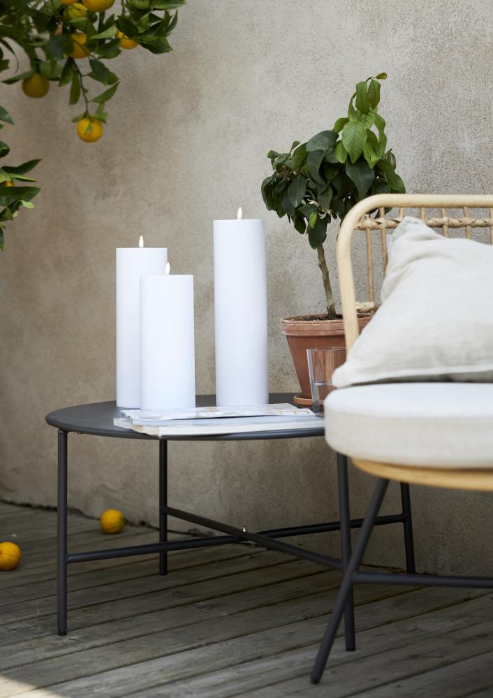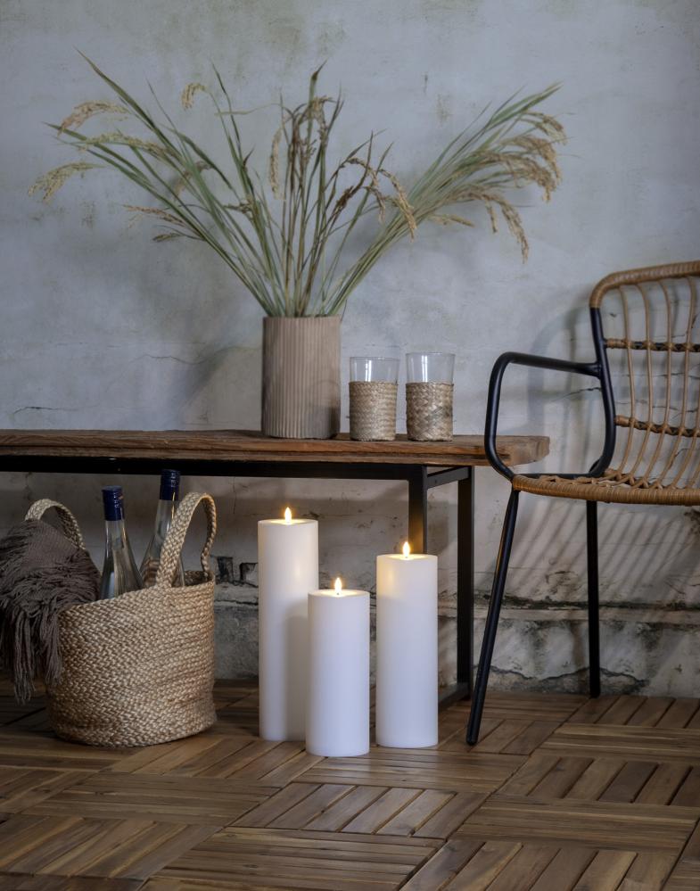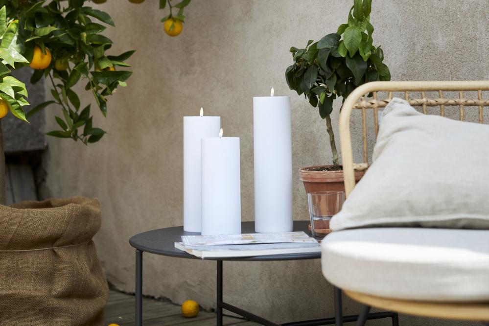 Et lys med varmt hvitt skinn for utendørs- og innendørsbruk. Modellen passer perfekt på terrassen, balkongen eller trappen for å ønske gjestene velkommen. Fint, stemningsfullt og brannsikkert i ett! Den naturtro Flamme-flammen gjør at lyset ser ut som et ekte blokklys. Det finnes tre størrelser av dette herlige store blokklyset for utendørsbruk.