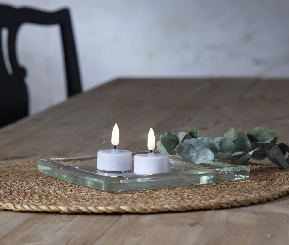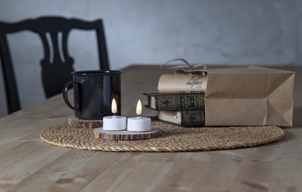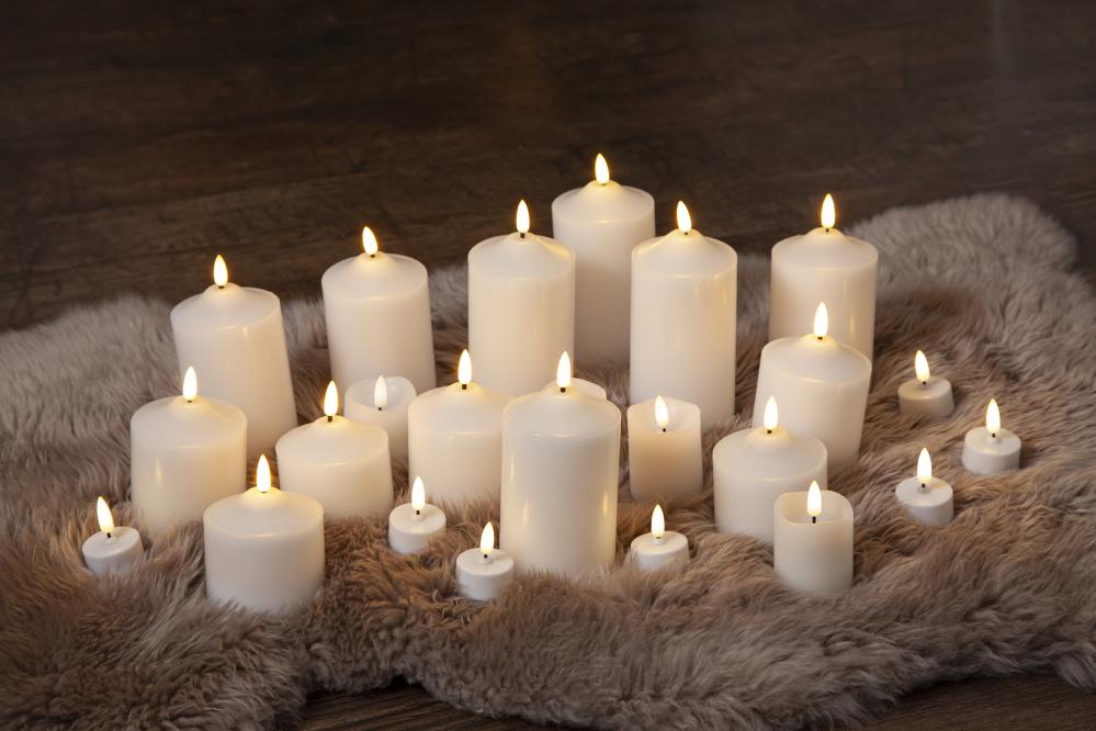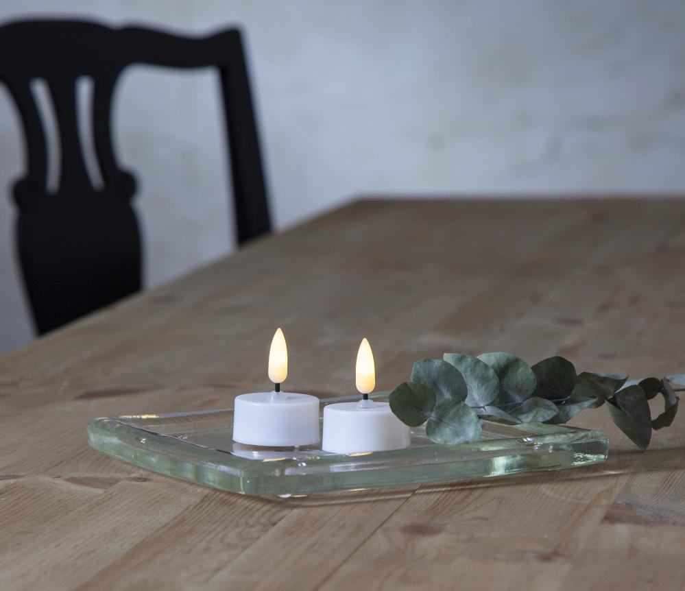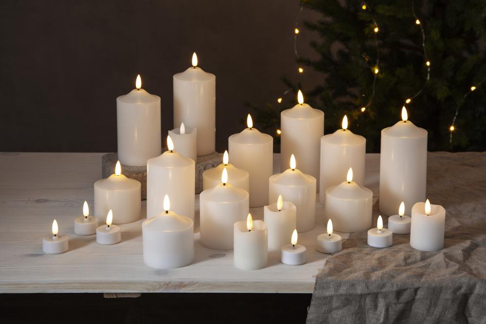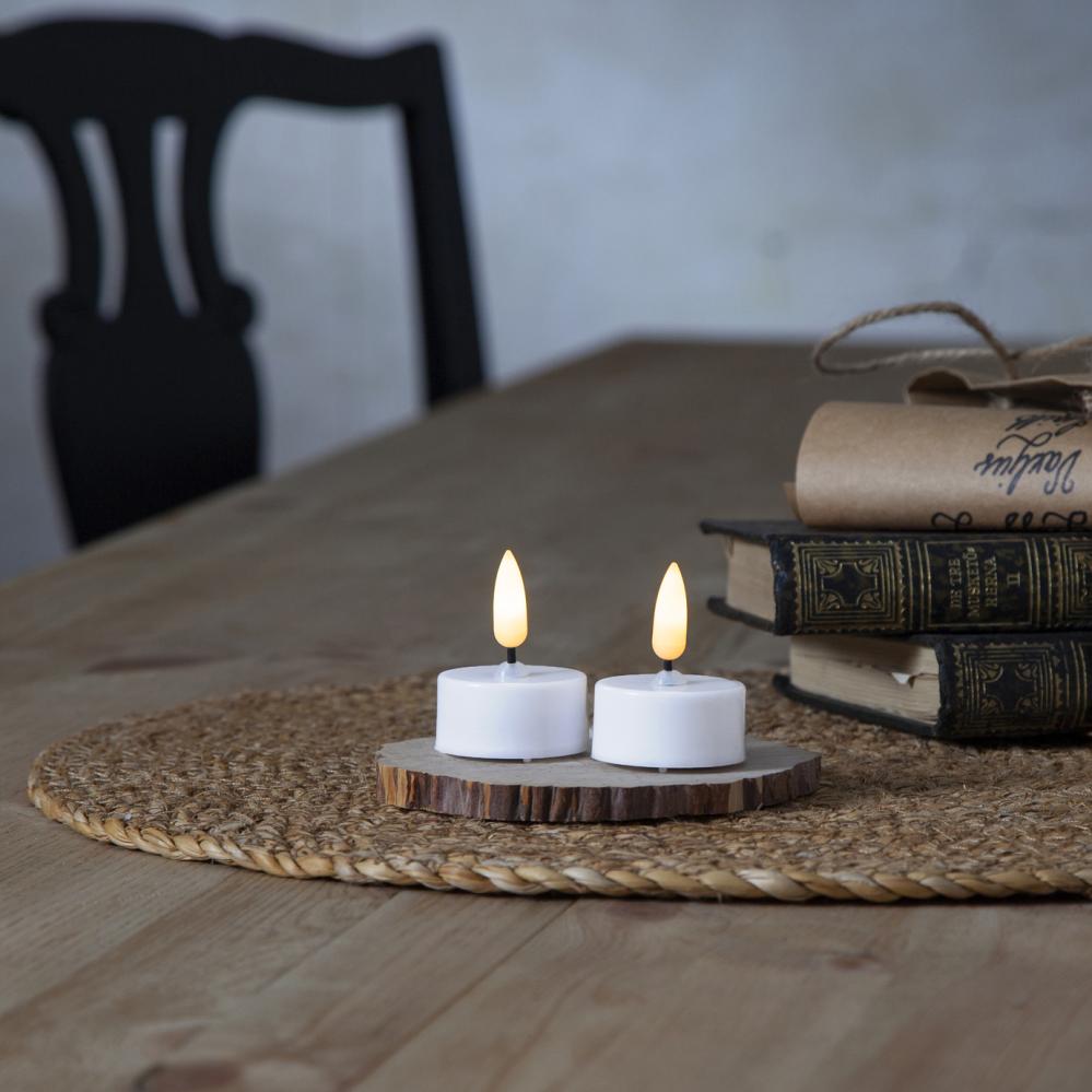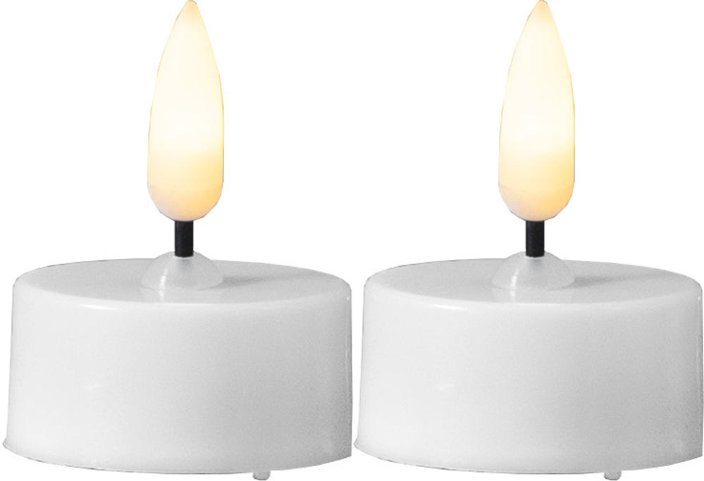 Realistiske LED-batterilys i form av 2 hvite votivlys. De har en varm hvit glød og en meget naturtro flamme, og er beregnet for innendørs bruk. Du aktiverer enkelt timeren på den svarte knappen, og da lyser lyset i 6 timer og er avslått i 18 timer, og gjentar seg til du slår av lyset. Fint, stemningsfullt og brannsikkert!