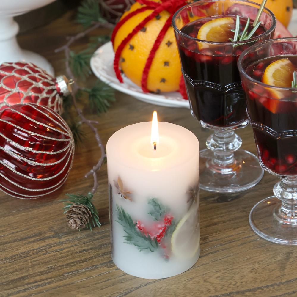 Et vakkert bloklys dekorert med flere av julens krydder, som stjerneanis, appelsin og vaniljestang.