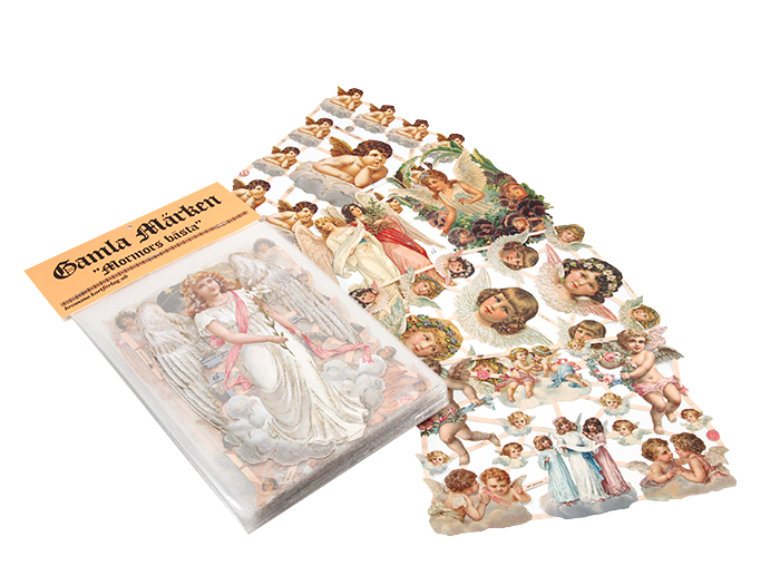 En fantastisk startpakke med 50-pakning eksklusive, nostalgiske og gamle bokmerker med engler i glitter. Klassiske vakre bokmerker med hoder av engler. Så fine å pynte med til jul og lage juletrepynt med glasur eller lime på julegavene.