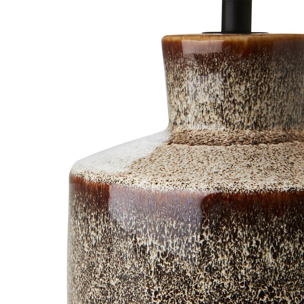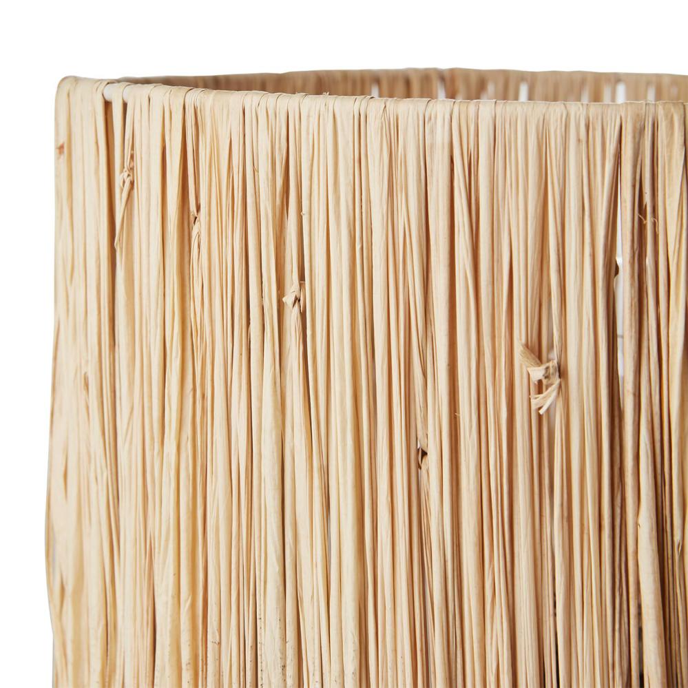 Vakker bordlampe med en fot i steintøy og en stilren skjerm i naturlig bast.