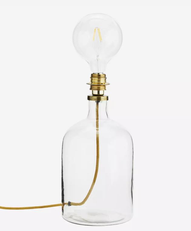 Vakker bordslampe med en fot i gjennomsiktig glass. Lampen ser ut som en flaske. Lampeskjerm i naturbast. 3 meter ledning med strømbryter. En svært vakker lampe som passer inn i de fleste miljøer. Den er stilren og passer utmerket i huset ved havet eller i den nordisk lyse leiligheten i byen. Varmen i lyset varierer avhengig av hvilken lyspære du setter inni lampeskjermen, men uansett blir lyset fantastisk.