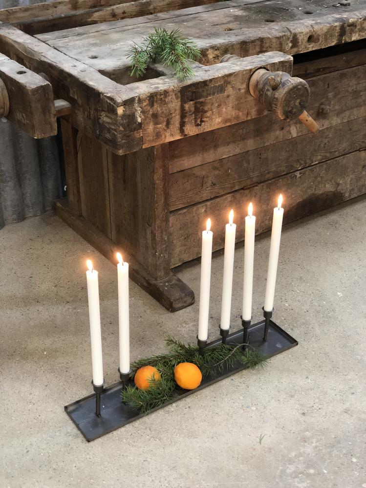 Supersmart og trendy bordslysestake i metall. 6 lysholdere på en rektangulær plate av metall. Ujevnt festet sammen slik at det er plass til dekorasjon på platen. Denne fine lysestaken vil være et vakkert blikkfang på bordet under alle årets høytider. Like fin på julebordet som på midsommeraften.