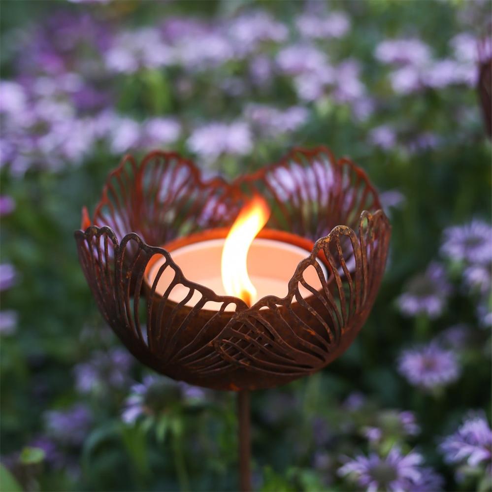 Vakker fakkelholder på pinne i rustet metall. Denne er inspirert av ginkgobladets unike form og årenett. Når flammen brenner, spres lyset gjennom bladets mønster og kaster myke skygger omkring seg – som et levende skyggespill i kveldsmørket. Ginkgo er en hyllest til naturens former og flammens stille skjær – like vakker tent som slukket.