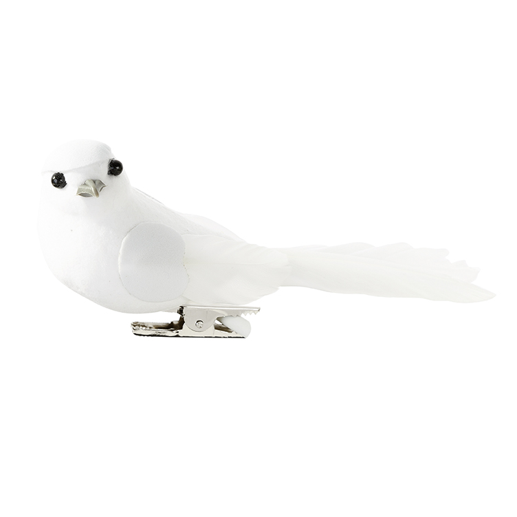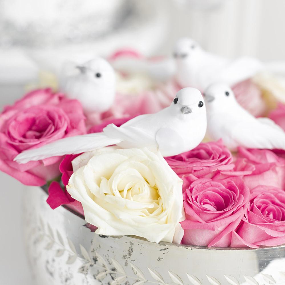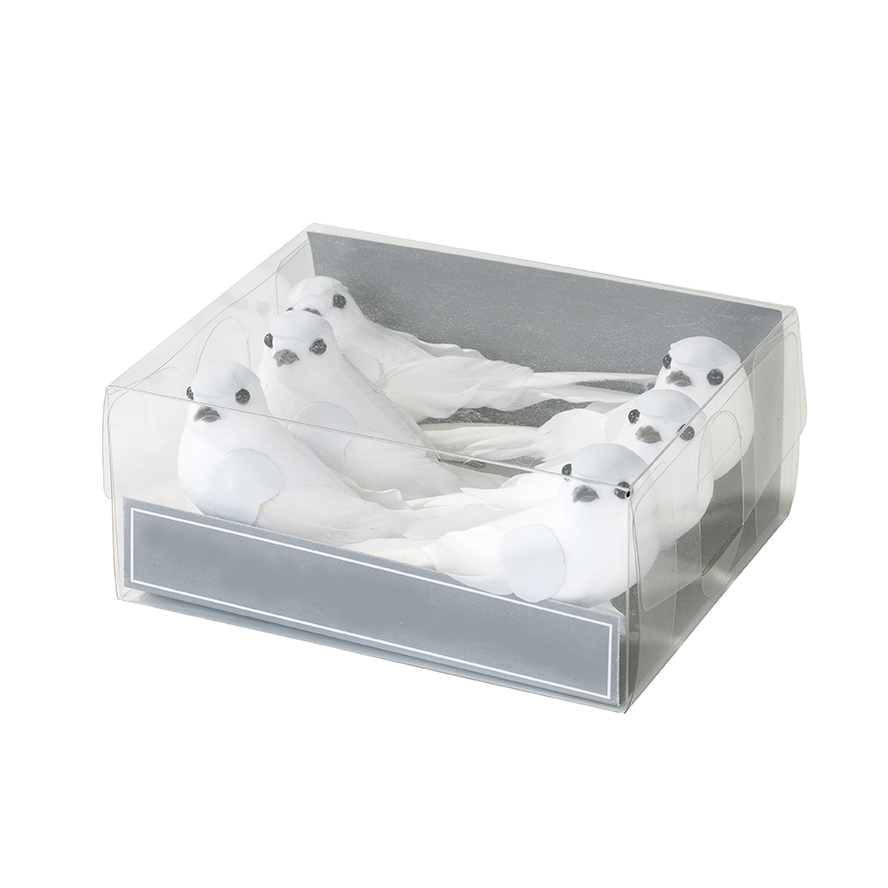 Vakre hvite dekorative fugler. Fest dem enkelt der du vil med en metallklype. 6 stykker per pakke. Mål: 10 x 4 cm.