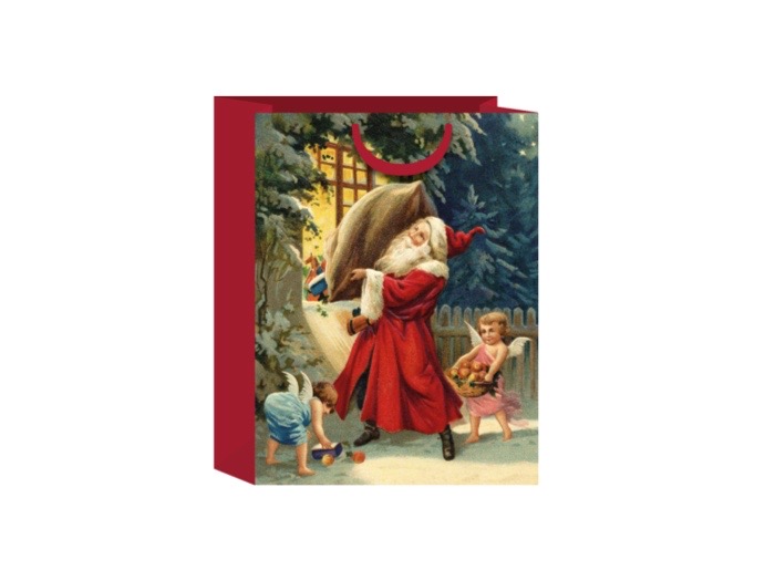Superfin gavepose til årets julegaver med et motiv av nissen med sin store gavepose samt engler som hjelper ham.