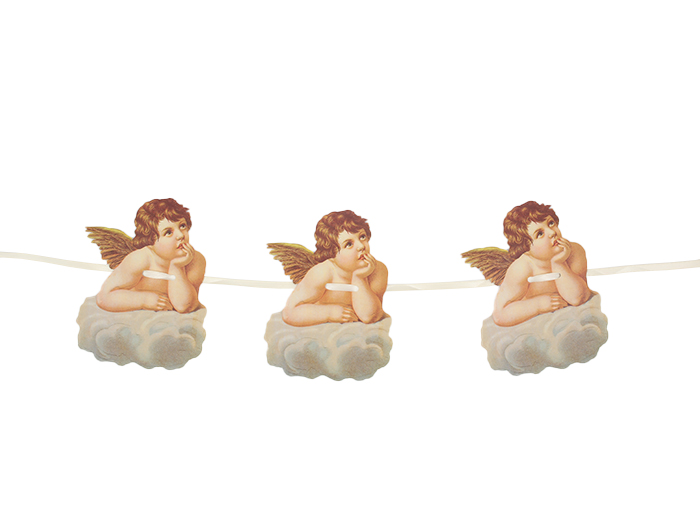 Denne fine girlangen med Rafael som hviler på sin sky er et klassisk motiv som blir en vakker dekorasjon i juletre, døråpning, vindu og vegg. Julemotiv, nostalgiske gammeldagse motiver på bokmerker. Bokmerkene er festet på silkebånd som er helt magisk fine å dekorere med året rundt.
