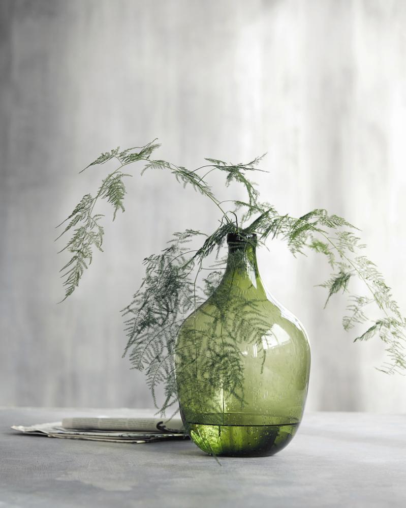 Stilig og vakker grønn damejeanne. En stor glassflaske som blir en lekker innredningsdetalj i hjemmet eller i offentlige rom. Resirkulert grønt glass. Superfin!