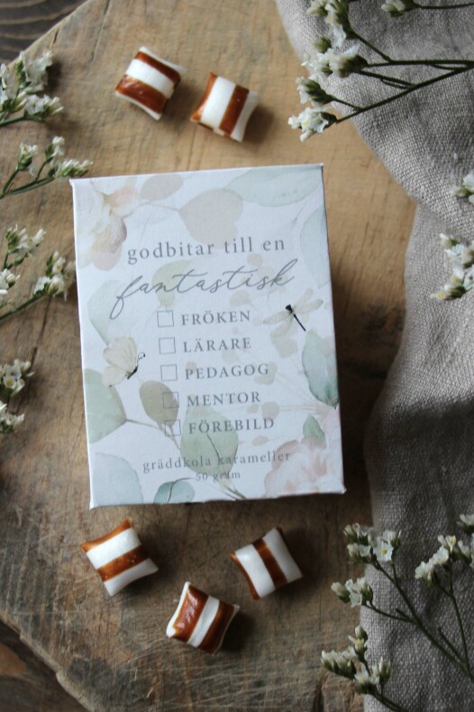 En helt underbar liten godisask med karameller i smaken gräddkola och texten "Godbitar till en fantastisk fröken, lärare, pedagog, mentor, förebild". Perfekt å gi bort til fröken, läraren, kollegaen eller vennen!