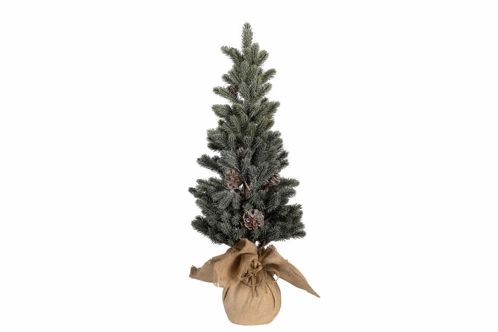 Stemningsfull naturtro bordgran med kongler. "Plantet" i en sekk av jute. Virkelig fin på et bord eller i et vindu.