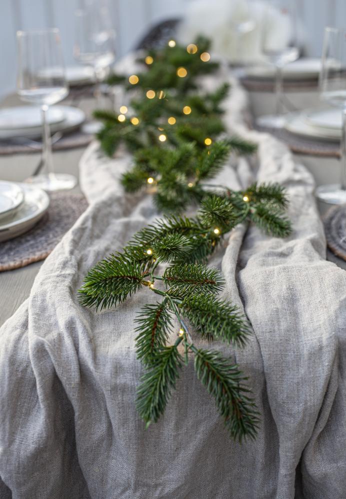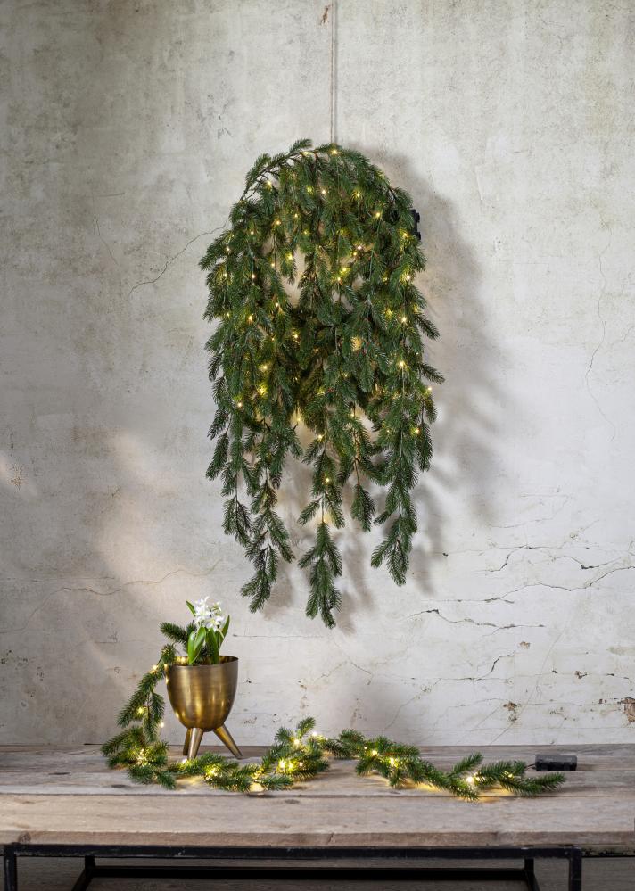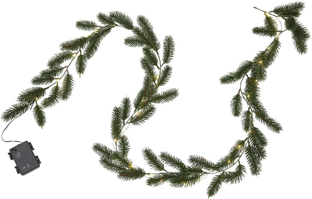 En vakker girlander med mørkegrønne nåler laget av PE-material som ser svært naturtro ut. Den er 180 cm lang og lyser opp med 30 varmhvite dew-drop LED. Drives av 3 AA-batterier og har innebygd timer. Batterier følger ikke med