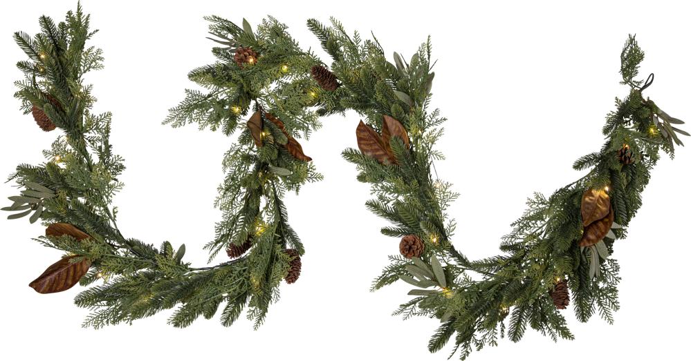 Mixi-girlanderen er laget av en blanding av blader og nåler, laget av PE-materiale. Den blir vakker som dekorasjon både innendørs og utendørs. Med 30 varmhvite duggdråper lyser den opp med et fint skinn, og slyngen drives av 3 AA-batterier, disse følger ikke med