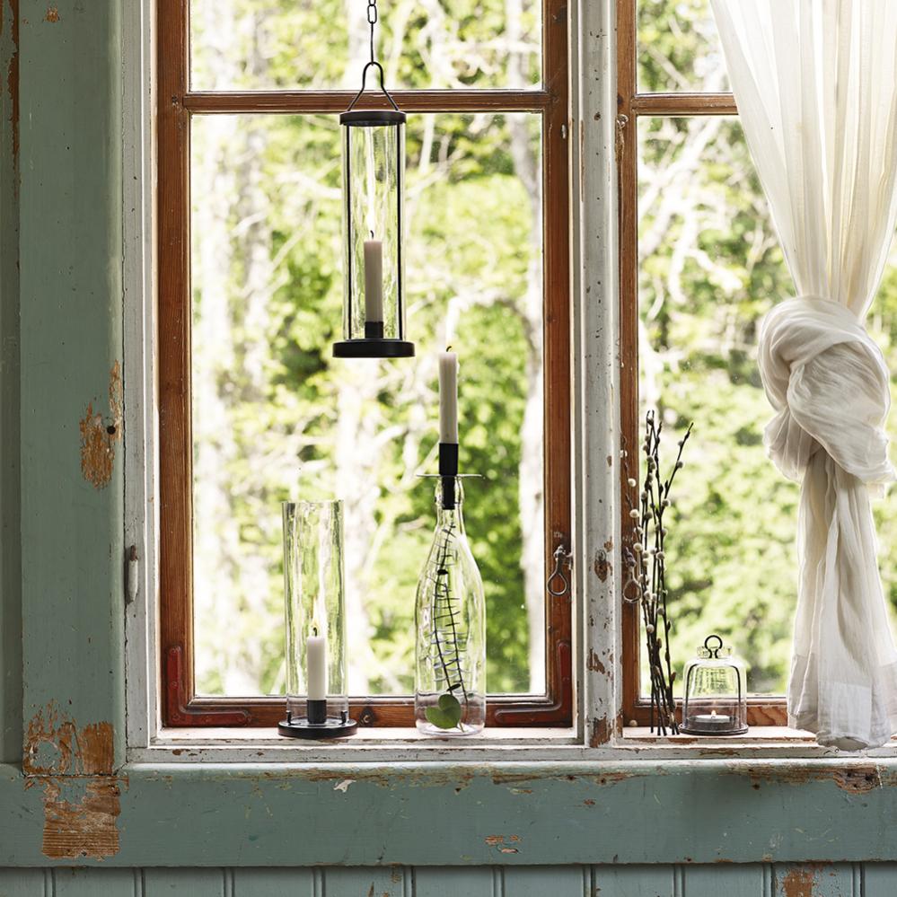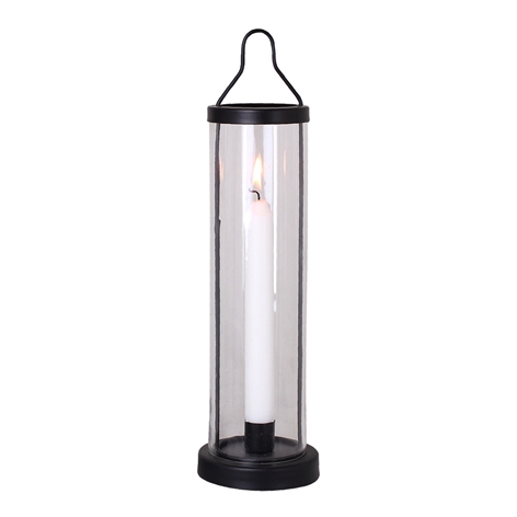 Lykt i glass og svart metall. Kan enten henges opp med sin krok, eller stå som den er. Passer til vanlige stearinlys/kronlys.