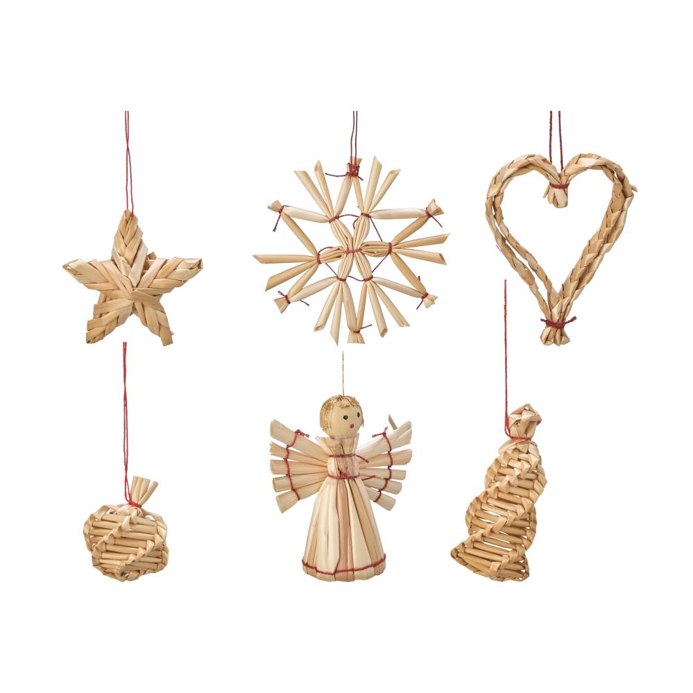 Halmfigurer som er superfine å henge på juletreet. Virkelig en spesiell og vakker juledekorasjon! Leveres i en liten eske med seks ulike figurer.