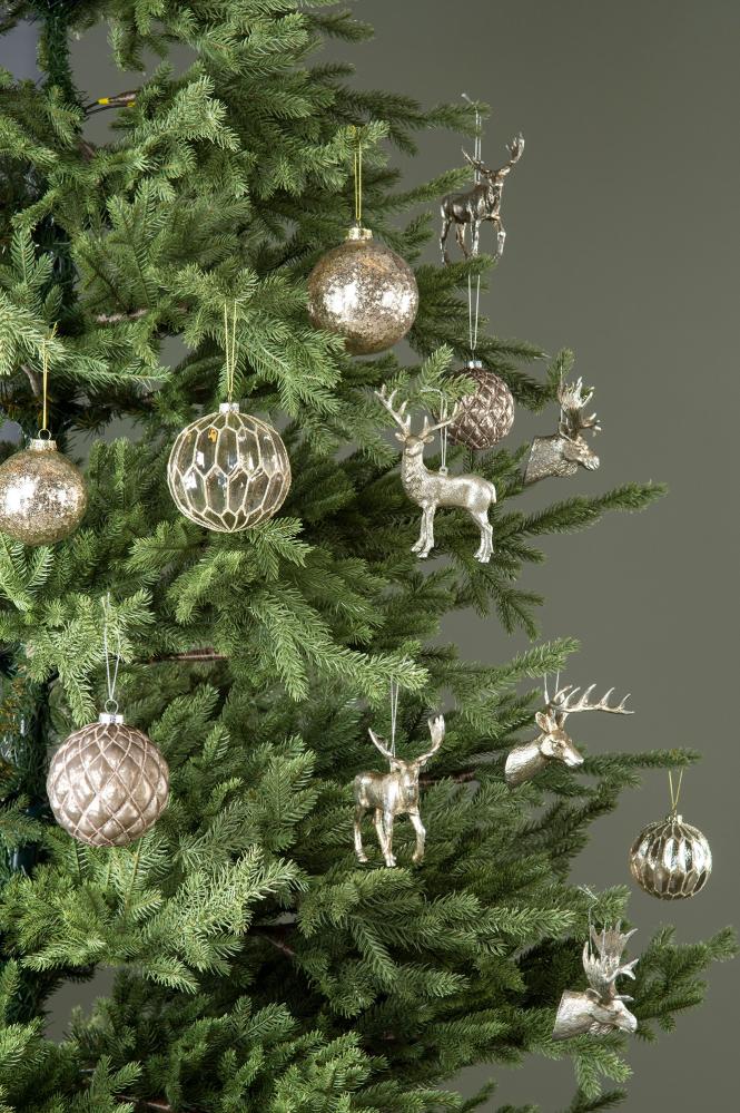 En vakker hjortekrone å henge på juletreet. Fargen er champagne og er gull- og sølvfarget. Passer derfor fint uansett om man vil ha en jul i gull eller sølv.