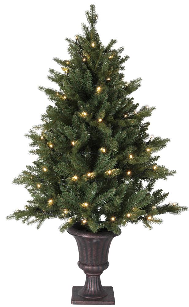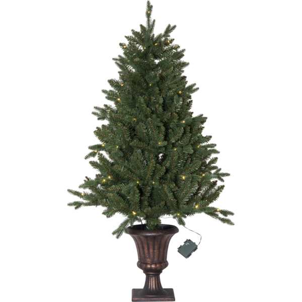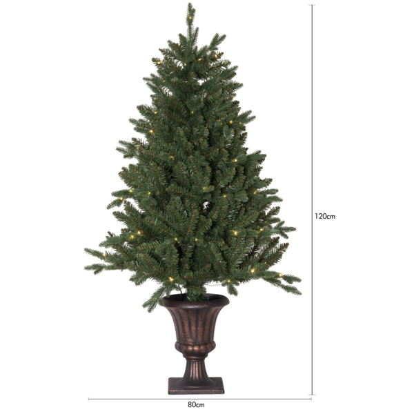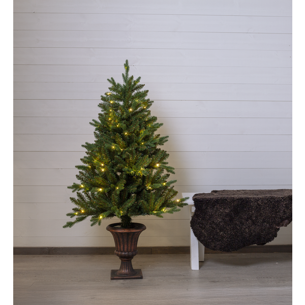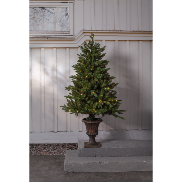 Jättefin julgran som står i en pokalkruka. Granen har belysning i varmvitt. Denna gran fungerar både inomhus och utomhus. Så fint och välkomnande att ha en på var sida dörren till jul. Denna modell passar bra både hemma och i offentliga miljöer så som restaurang, kontor eller hotell. Denna modell är 120 cm hög och blir också sett supersött julträd till ett barnrum.