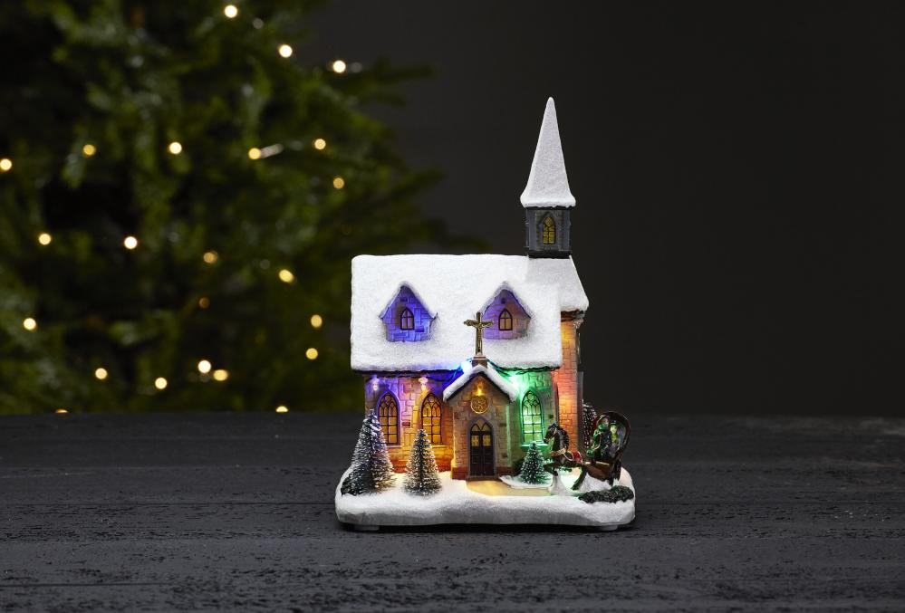 By med kirke, kor og fine detaljer. Flere lyspunkter som skaper en herlig julestemning både tent og slukket. Drives av 3 stk AA-batterier, produktet har timerfunksjon.