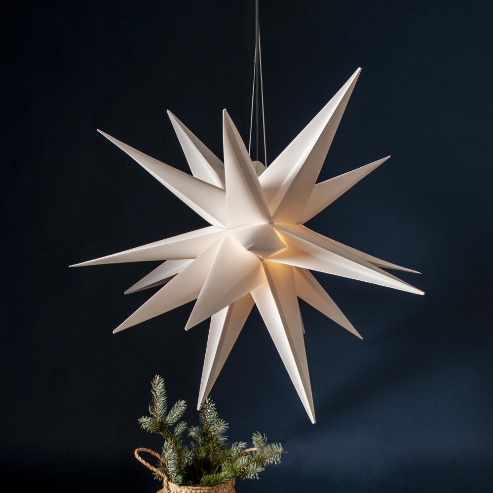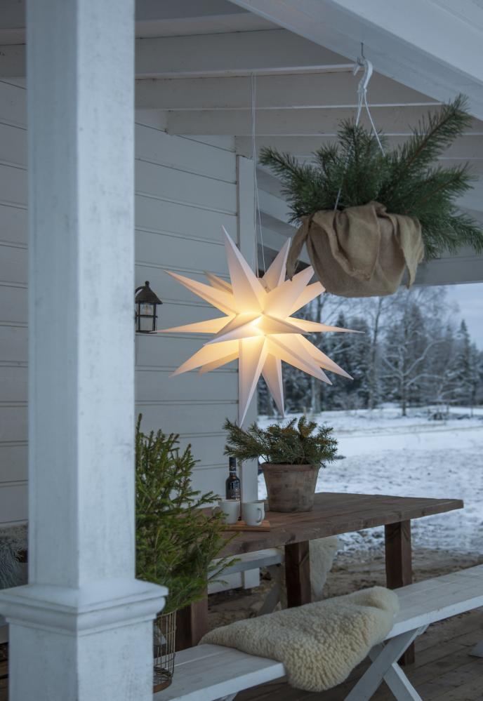 Massiv, 1 meter stor, hvit tredimensjonal stjerne for utendørs bruk. Lyser med varmhvitt lys (LED-pære inkludert). Den innebygde timeren gjør det enkelt å stille inn når stjernen skal lyse. Lyser opp hagen, eller hvorfor ikke henge den over spisebordet innendørs. Den sprer en herlig stemning hele vinteren.
