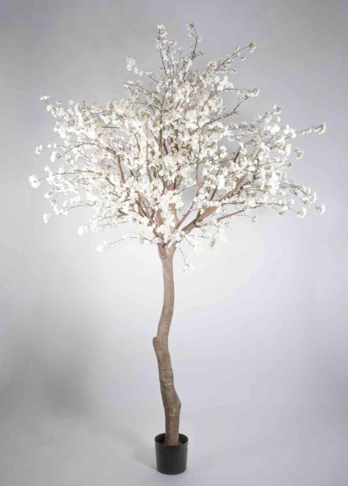 Stort kunstig tre med kirsebærblomster i hvitt.