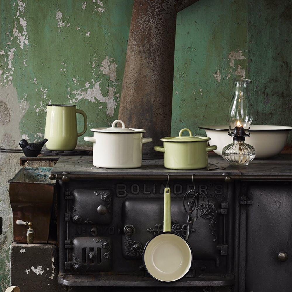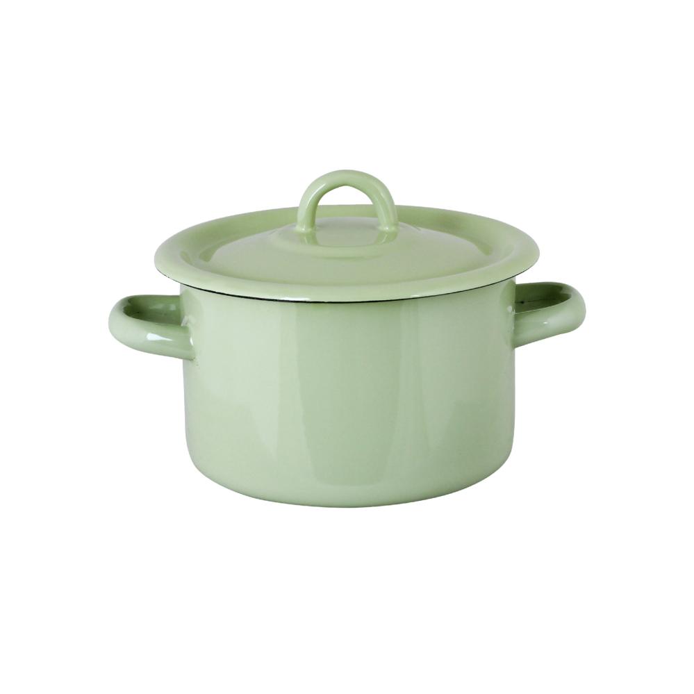 Kjele med lokk og håndtak i grønn emalje. Lokket har en malt kant i svart. Den tåler å plasseres på alle typer komfyrer, både gass og induksjonstopper. Flott å kombinere med våre andre emaljprodukter for å skape den herlige, gammeldagse følelsen på kjøkkenet! Våre emaljekjeler holder høy kvalitet, og vi anbefaler håndvask for lang holdbarhet.