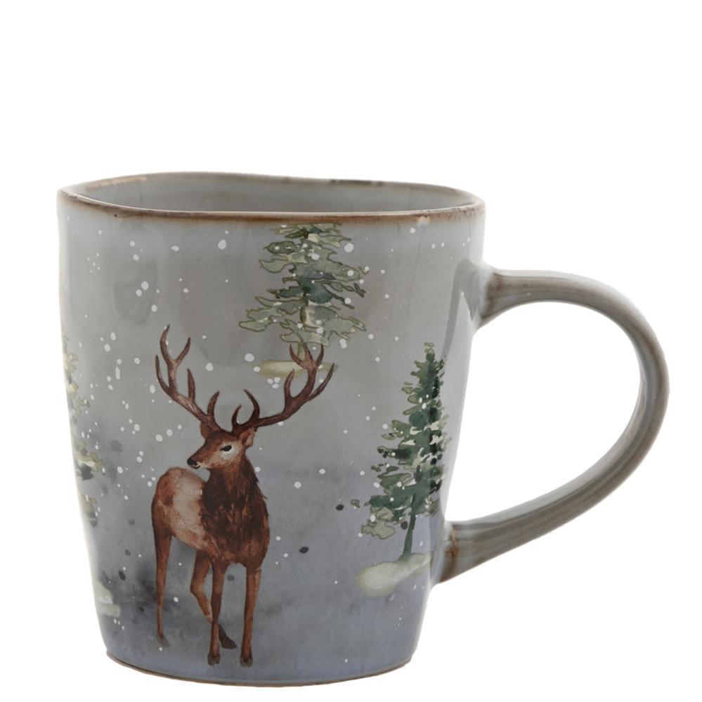 En nydelig kopp med et reinsdyr. En kopp med skogmotiv og snøflak. Om dette er et reinsdyr eller en hjort strides de lærde på Frøken Frøken :-) Uansett er den laget av keramikk. Tåler oppvaskmaskin og mikrobølgeovn. Tenk på å ha disse foran peisen på en hytte i fjellene... Eller på kjøkkenet i leiligheten i storbyen :-) Fine overalt! En virkelig fin vinterkopp som passer perfekt å ta frem på hytta og drikke av året rundt, mener Frøken Frøken. Veldig god å drikke av, kan jeg bekrefte. Perfekt gave til jegeren eller til alle oss som elsker vakre dyr og herlig porselen. Enda finere i virkeligheten enn på bildet. Flott som julegave! Vi har tallerken, skål, krus, gløggkopp mm i samme serie.