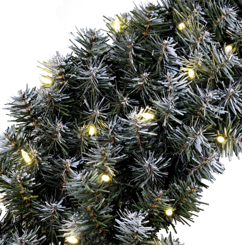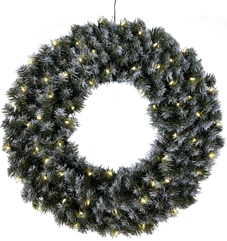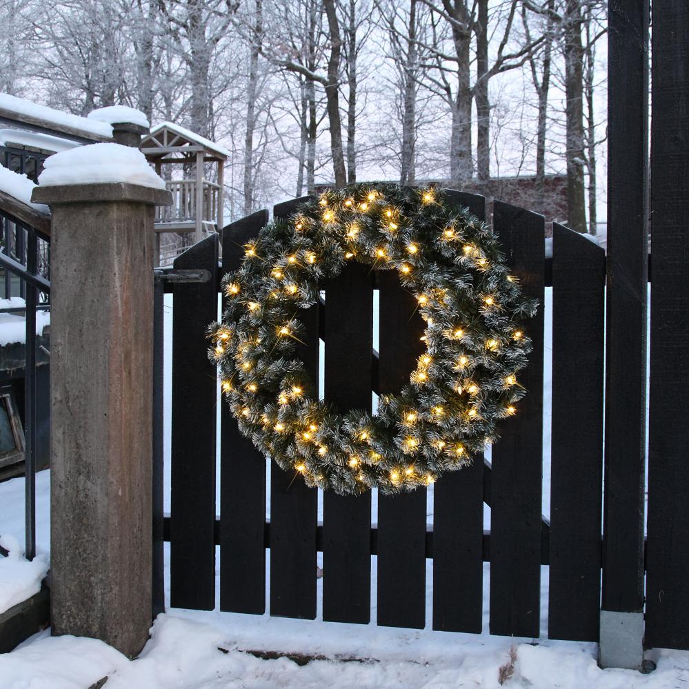 Stor, imponerende og helt fantastisk vakker julekrans med belysning og snø - En virkelig fin krans av kunstig gran med LED-belysning! Heng den som en dørkrans på en større ytterdør, på husfasaden eller på utsiden av vinduene på huset. Eller innendørs som en veggkrans på veggene i gangen eller stuen over sofaen.