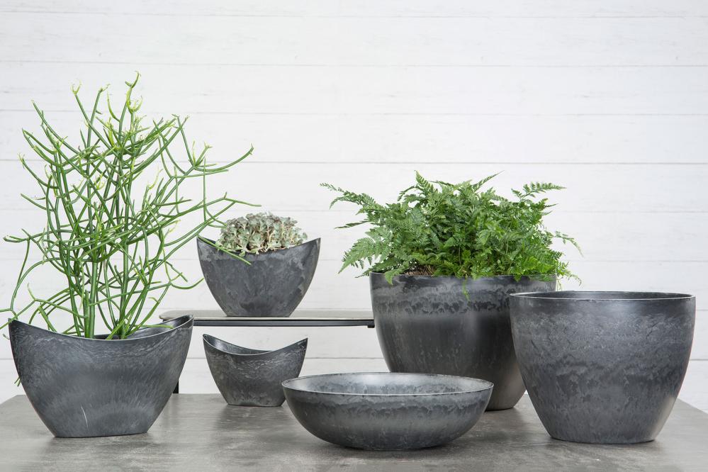 Stilig og fin gråmelert krukke som ser ut som betong, men er laget av plast. Supert der man ønsker en blomsterkrukke som absolutt ikke lekker vann.