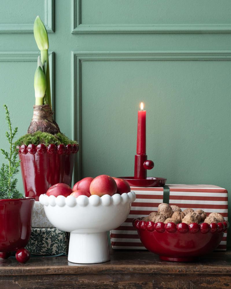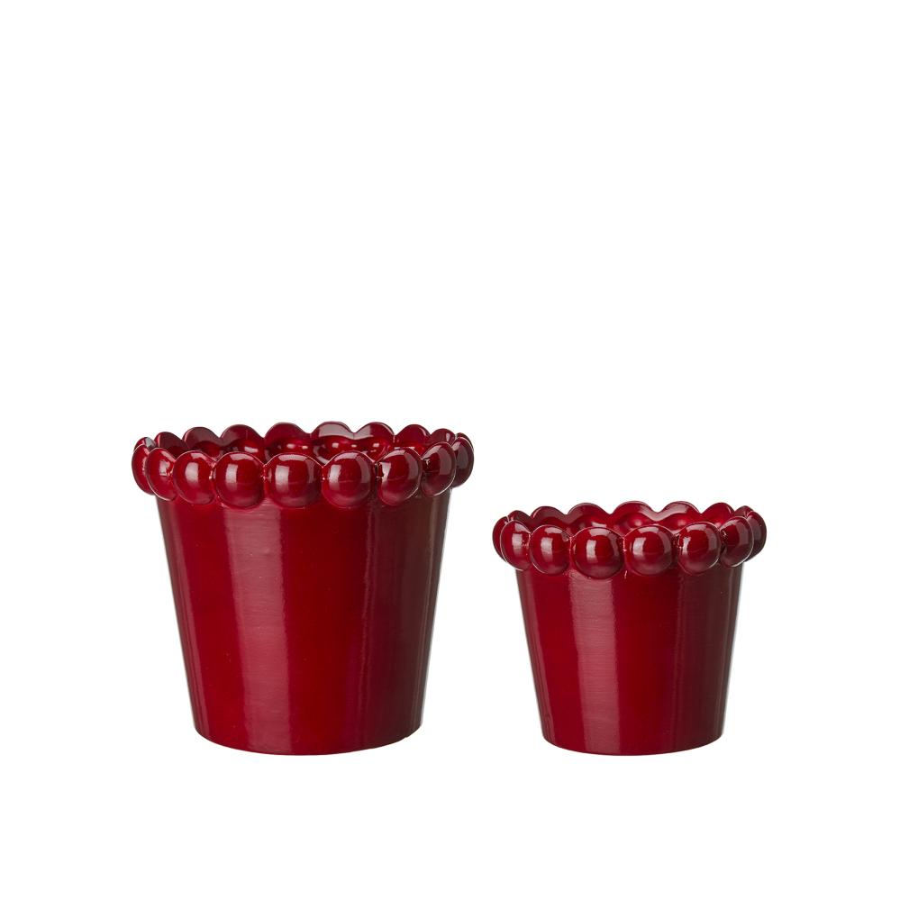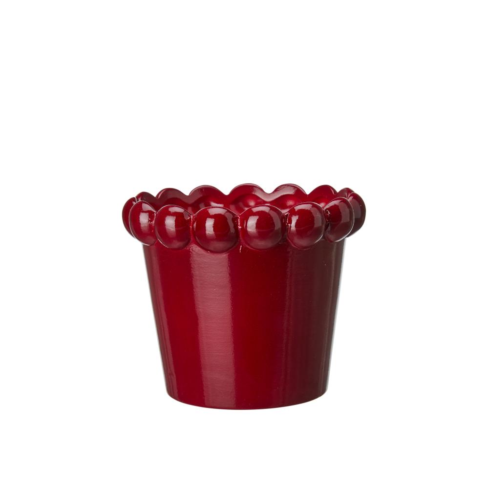 Rød liten krukke. Passer perfekt til juledekorasjonen og for å sette plantene dine hjemme. Elegant og fin med den boblede kanten øverst. Finnes i to størrelser og flere modeller i samme serie.