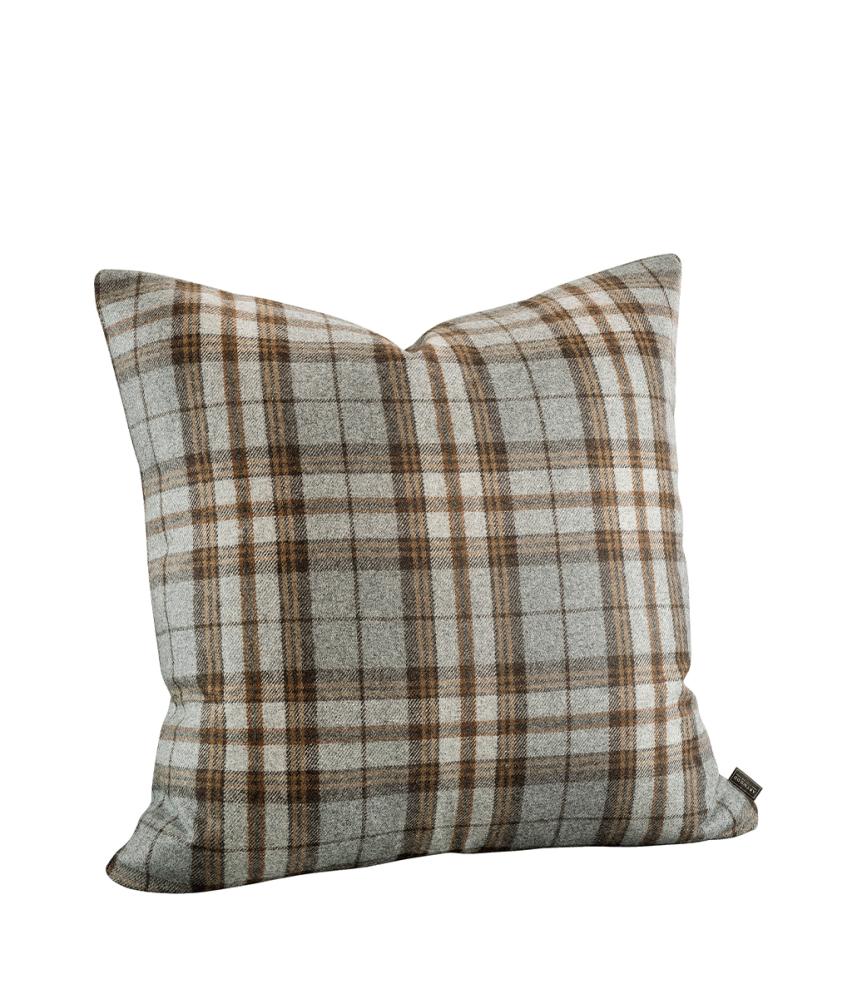 Charlet Brown, et putetrekk som blir en vakker blikkfang og en stilig innredningsdetalj i en sofa, lenestol eller på en seng. Superfin pute i grått, brunt og beige rutete ullstoff. Dette putetrekket passer utmerket om høsten og vinteren. Veldig fin året rundt i en rustikk innredning, for eksempel i en fjellhytte. Tenk på følelsen med disse i soverommet eller i sofaen foran bålet i en fjellhytte i Åre.