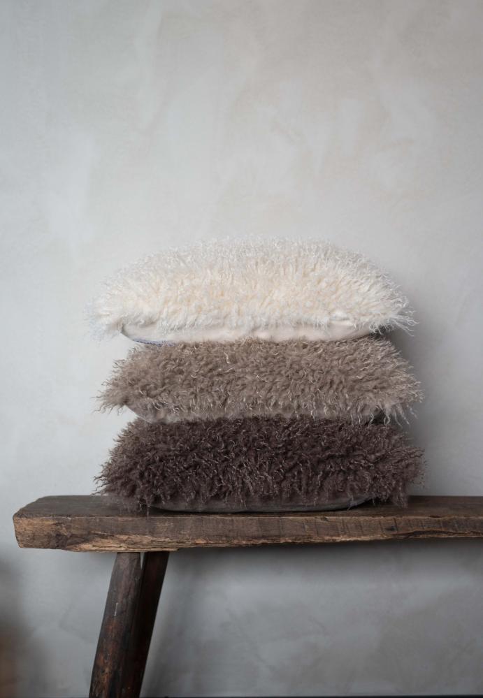 Kuddfodral laget av pelsimitasjon av tibetansk saueskinn, med en bakside av kunstig semsket skinn som gir den en myk og varm følelse.