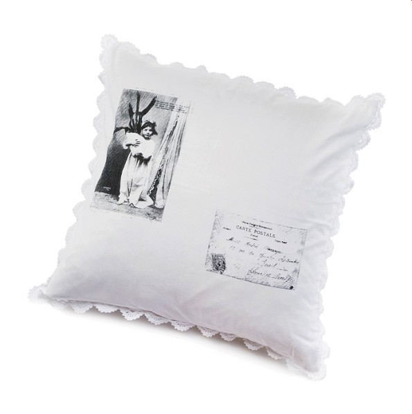 Kuddfodral med postkorttekst og fotografi. Hvit bunn og trykk i gråsvart. Heklet blondekant rundt. Veldig fin!