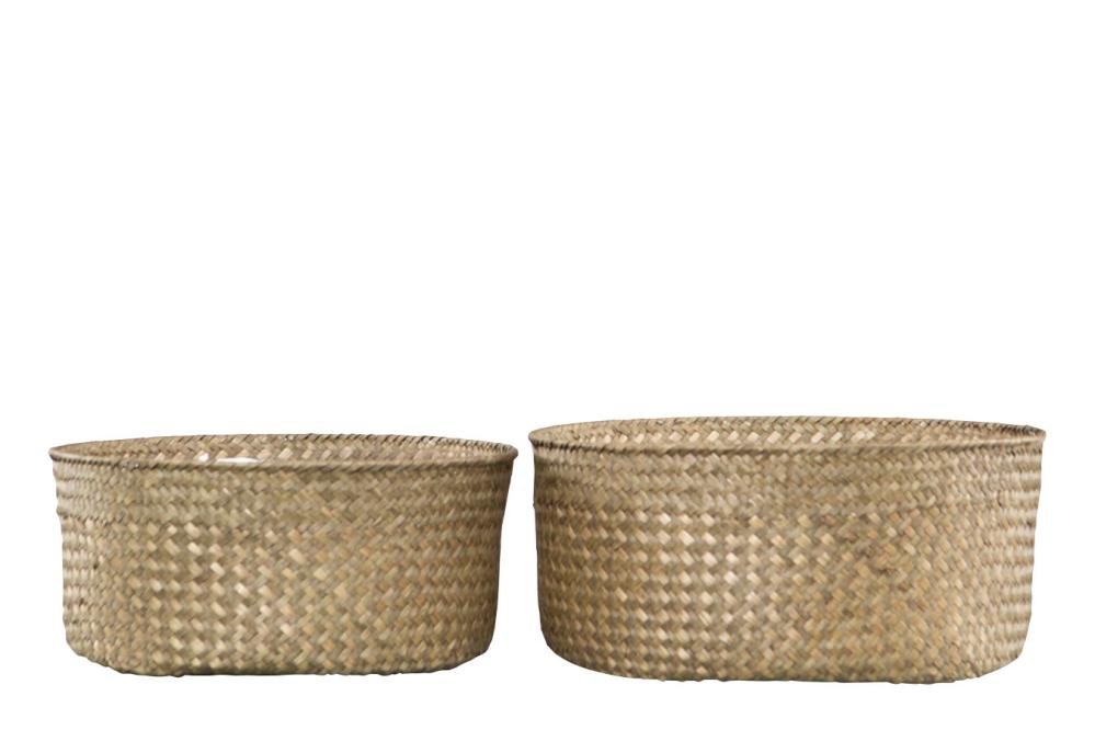 Et 2-pakning med runde naturfargede kurver med lav kant. Plastforing pa innsiden. Bruk dem som blomsterpotter eller til oppbevaring på badet kanskje.
