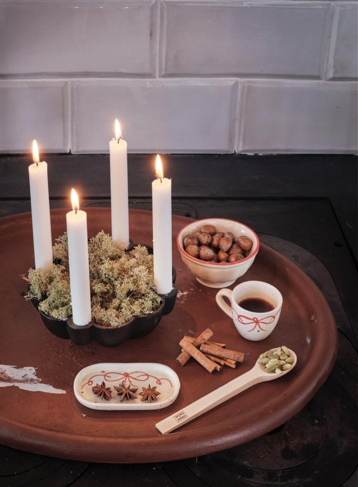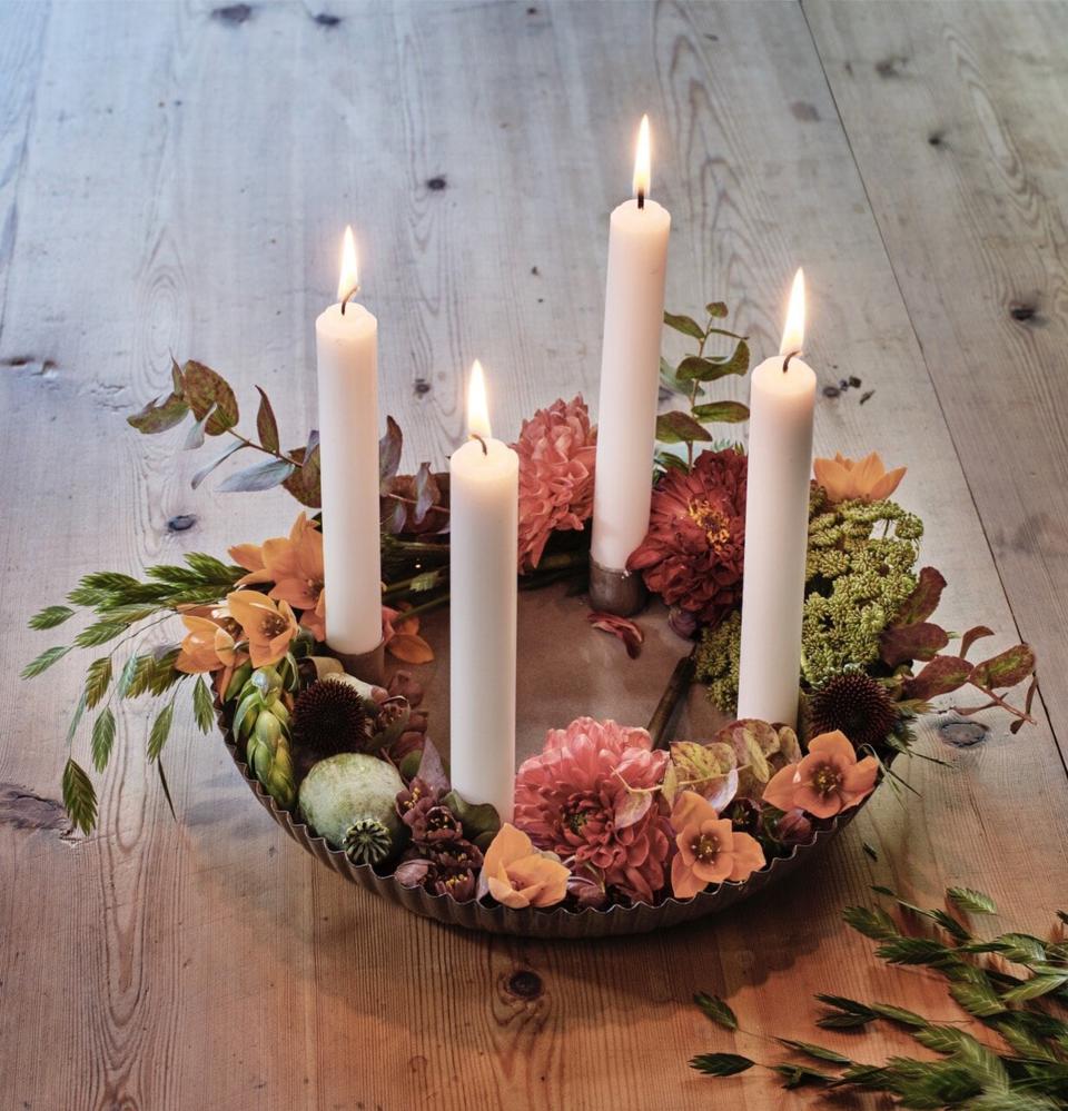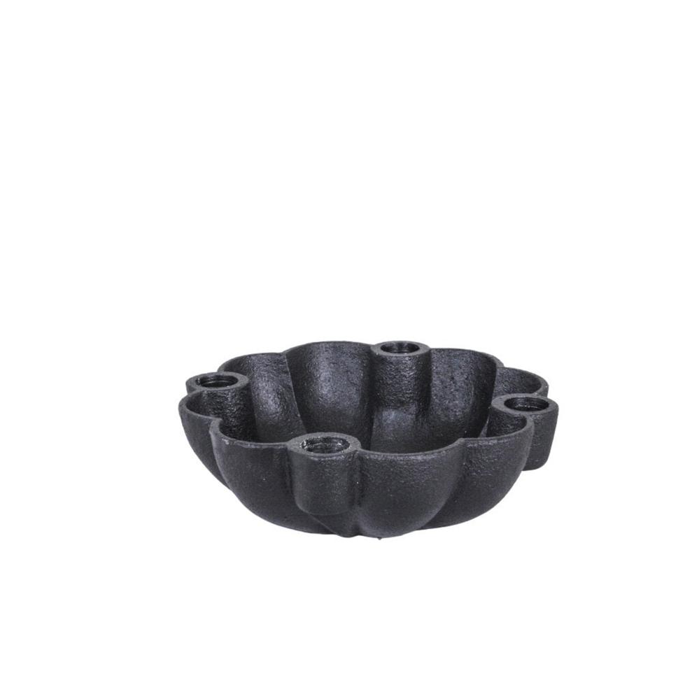 Skålformet lysestake med bølgete kanter i støpejern med plass til fire kronelys. Dekorer skålen etter sesong, så blir den brukbar hele året.