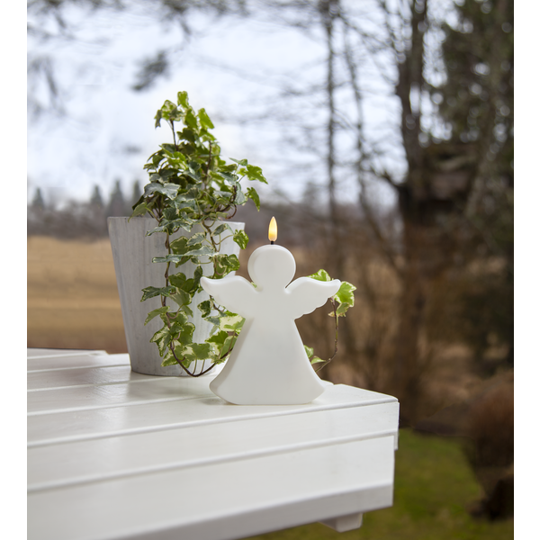 En vakker lysengel, flott som gravlys, til minnealter og i vinduet. En fin glød som lyser opp i mørket. Lyset drives av to AA-batterier, ikke inkludert. Dette lyset lyser like fint inne som ute med timer. 6 timer på, 18 timer av, gjentakende.