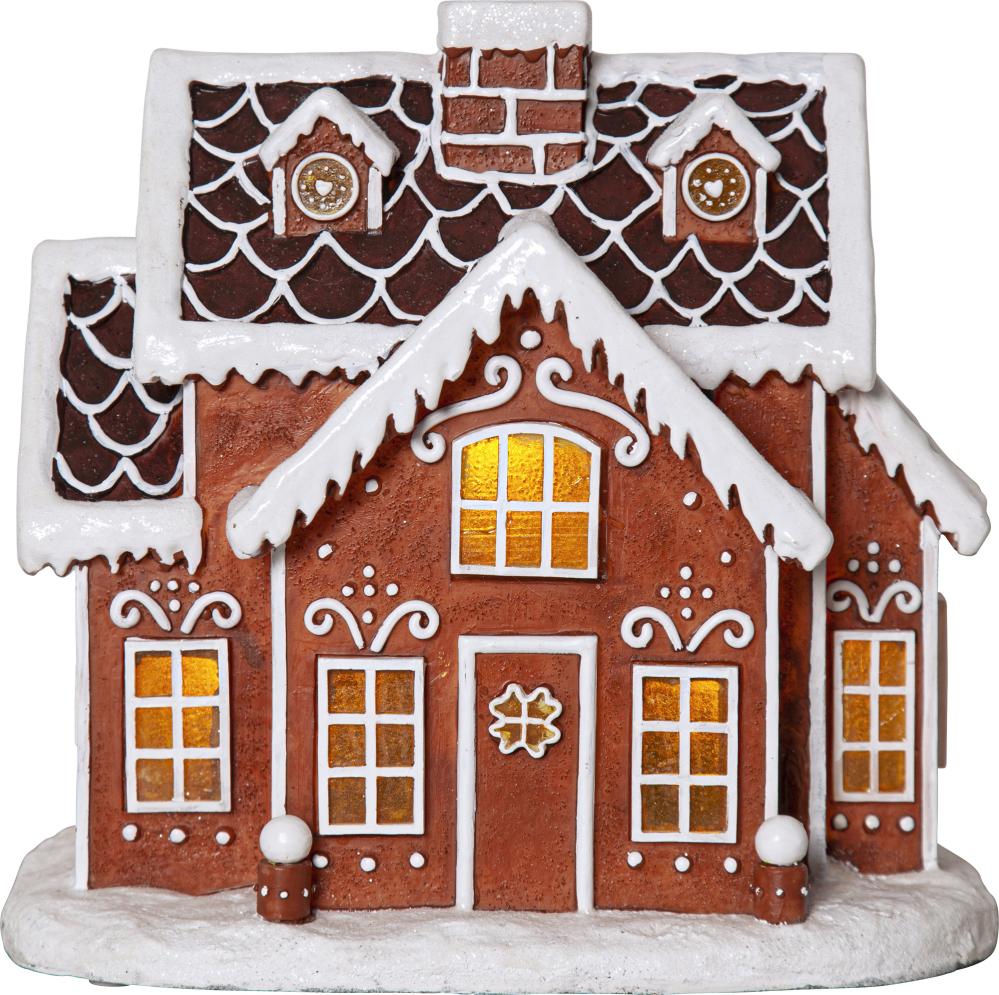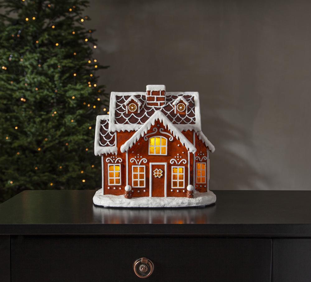 Fantastisk juledekorasjon i form av et pepperkakehus. Når produktet er slått på, lyser det vakkert i vinduene.