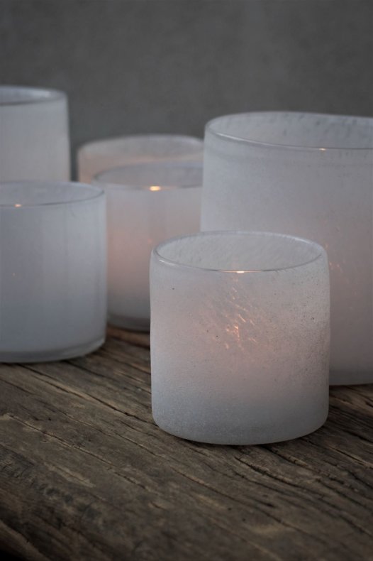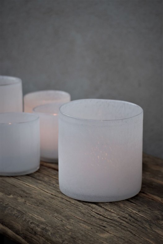 Vakker frostet hvit lyslykt. Lyktene er håndlaget i munnblåst glass, så hver lykt er unik.