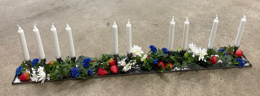 Superlekker og virkelig lang lysstake for 10 kronelys. Dekorer fatet med mose og røde bær til jul og blomster til midtsommer. Stilig å ha fatet tomt også for en virkelig stilren industriell følelse. Denne lysstaken er håndlaget, og lysbærene kan peke litt i forskjellige retninger og merker/riper kan forekomme. Det er en del av sjarmen synes vi! Ellers kan man pynte brettet med noe vakkert. Stiligere lysstake til festbordet eller kjøkkenbordet til hverdags for oss som elsker å tenne masse lys kan ikke finnes!