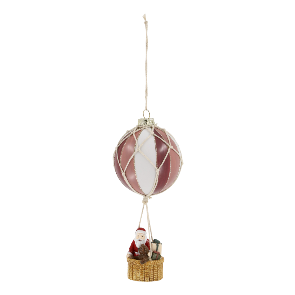En morsom og annerledes julekule som er håndmalt og forestiller en nisse som flyr i luftballong med gavene sine.