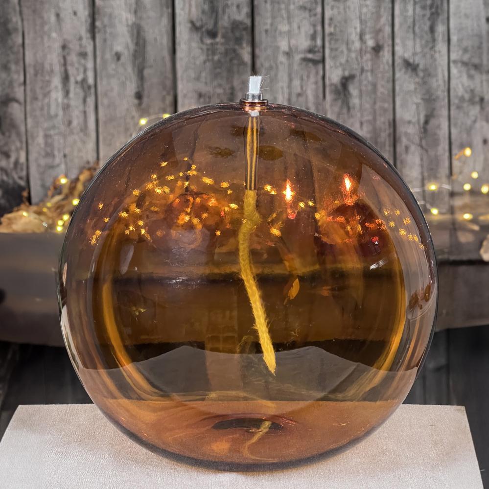 Oljelampe i glass med glassfiberveke. Frøken Frøkens vakre oljelamper finnes i mange modeller, størrelser og farger. Vi har runde store og små glasskuler, flate glasskuler og sylindere mm. Plasser dem individuelt og i grupper for å skape en unik atmosfære i ditt hjem eller under tak i din hage. Miks og match og finn din favorittkombinasjon.