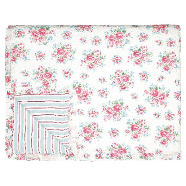 Superfint blomstrete quiltet rosa overkast - Bed cover Tess white. Vakkert på jenteværelset, gjesterommet eller på hytta! Passer til enkeltseng. På en 90 cm bred seng henger det ned 25 cm på hver langside. Fungerer også tvers over fotenden på en dobbeltseng!