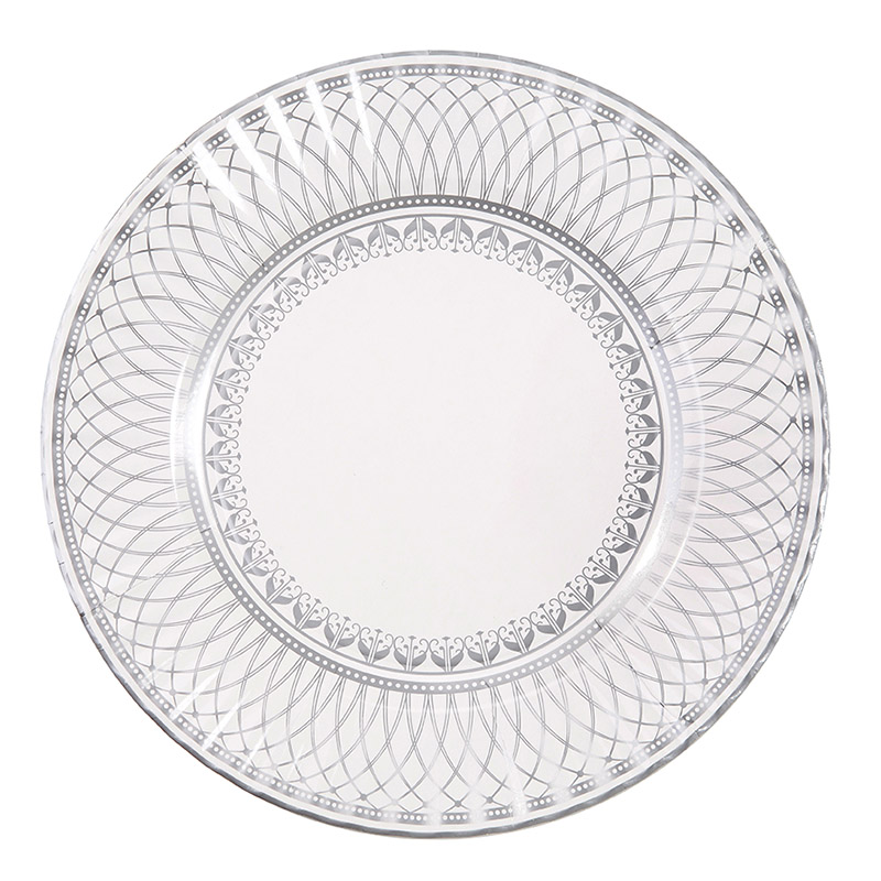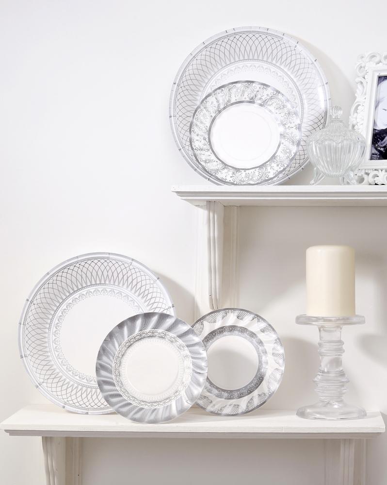 Supervakre store papptallerkener i hvitt og sølv. Bland og match ditt arvede porselen med disse papptallerkener så sparer du tid og krefter på oppvask under festen. Passer like bra til bryllup som til pikniken på stranden.