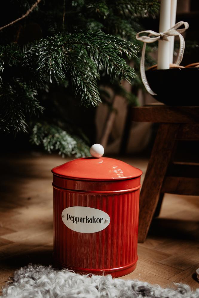 En klassisk plåtburk for pepperkaker. Burken er i fargen julerød og har en hvit knopp på lokket og en silikonring rundt burken så lokket slutter tett. Så fin å ha i det klassiske julehjemmet. Perfekt å stille frem på julaften og under hele desember. Disse burkene er håndlagde, noe som gjør at ujevnheter og ulikheter kan forekomme, og de tåler ikke oppvaskmaskin.