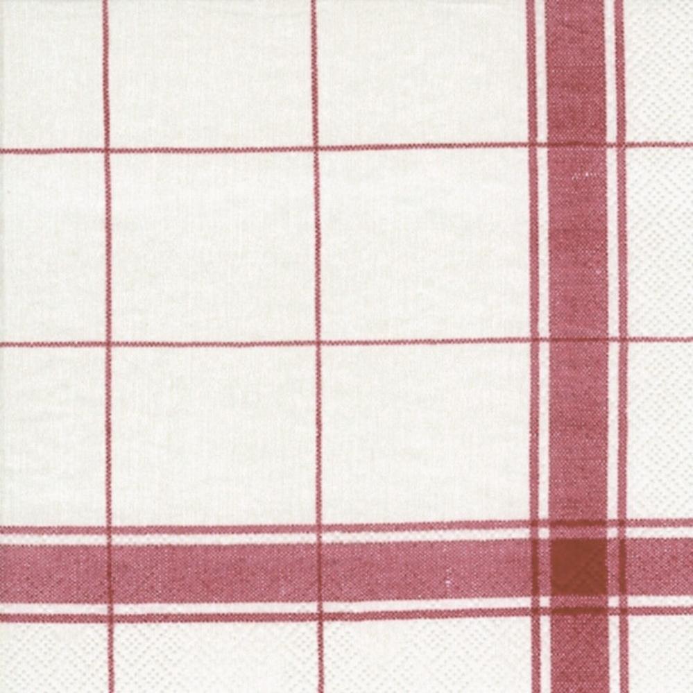 Papirserviett med mønster som minner om et gammeldags kjøkkenhåndkle i ruter. Denne servietten er i en mørkere julerød farge med lyst linfarget bunn. Fargen er virkelig flott og kommer ikke helt til sin rett på bildet.