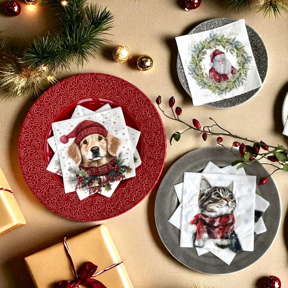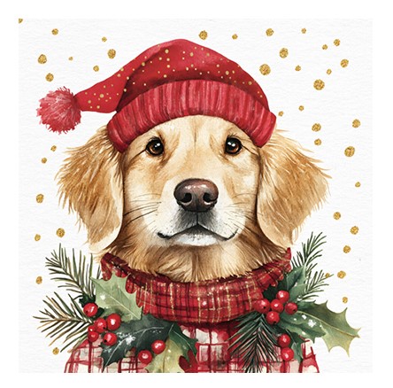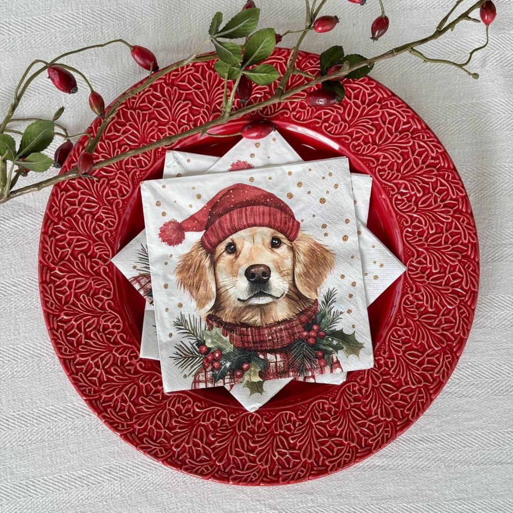 En serviett med et søtt og julete motiv av en hund med nisselue.