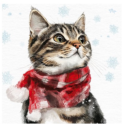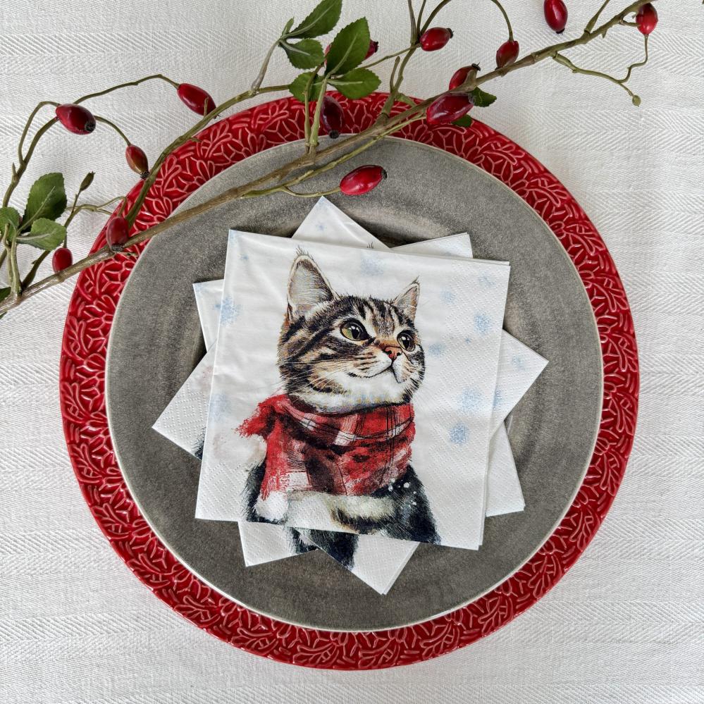 En serviett med et søtt og julete motiv av en katt med rød skjerf.