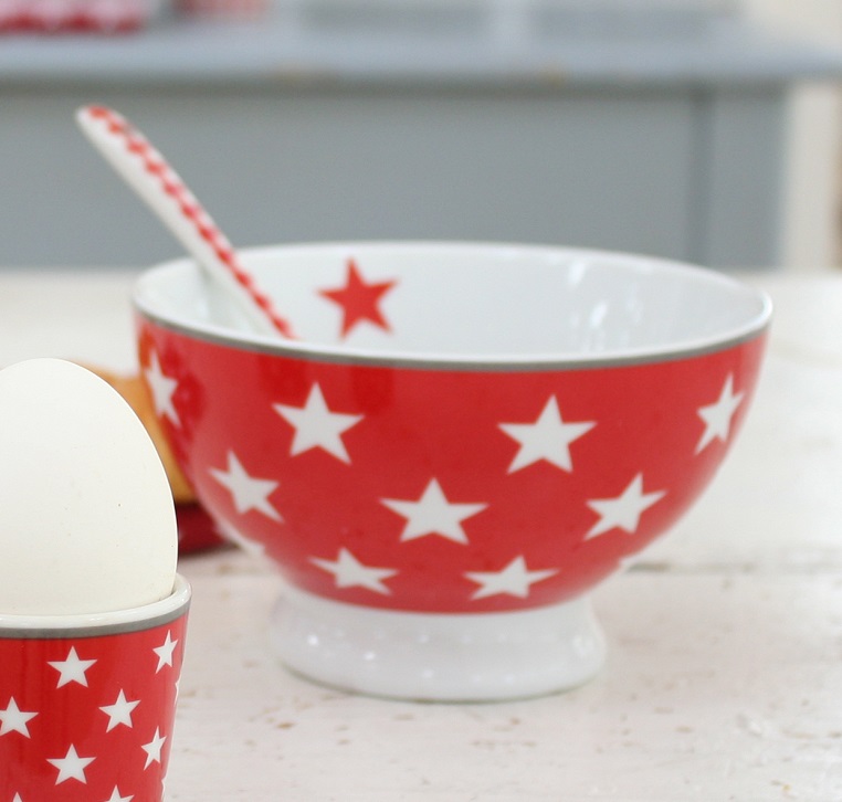 Vakker rød skål med hvite stjerner og en stjerne på innsiden av skålen. Skål fra serien Happy fra Krasilnikoff. Nostalgisk, koselig og fin skål å dekke med. Passer perfekt til frokostblandingen eller som godisskål.