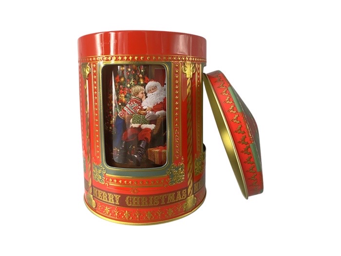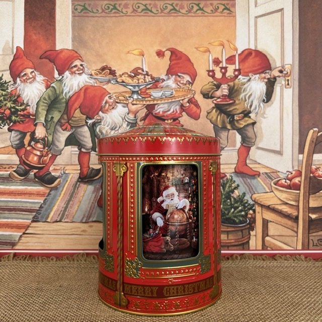 Speldosa i form av en plåtburk i metall. Motiv med jultomten och julgranen som får paket.