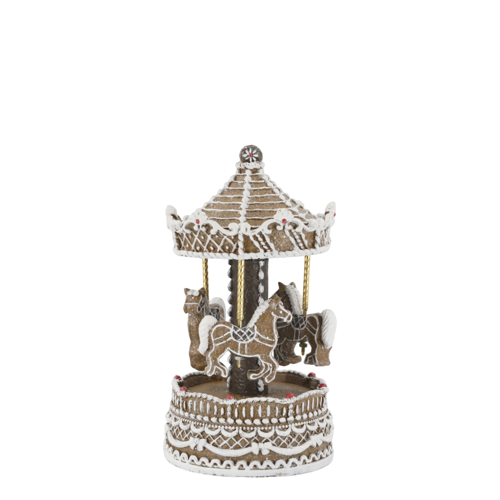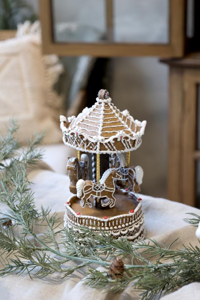 En søt spilleboks som forestiller en karusell med hester dekorert som et pepperkakehus. En fin dekorasjon til jul, men også en flott julegave.